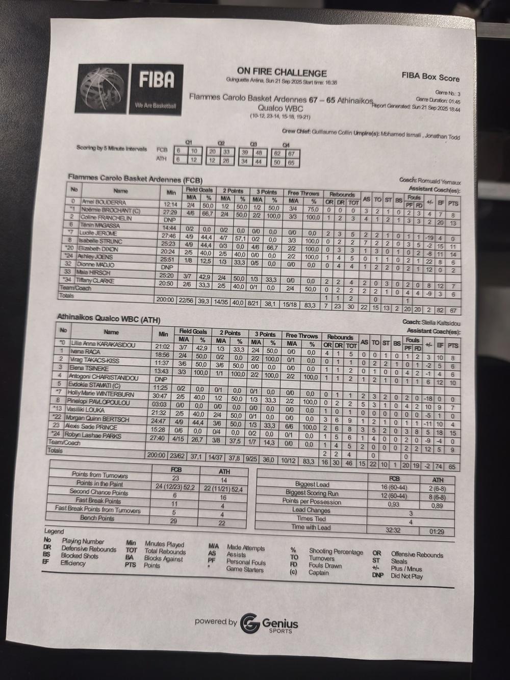 CAROLO FLAMMES: Bouderra 8(1), Brochant 13(2), Magassa, Jerome 11, Strunc 14(4), Dixon 6, Joens 2, Hirsch 7(1), Clarke 6.