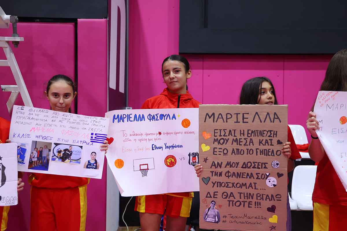 Καμία στιγμή δεν μάς έδωσε περισσότερα χαμόγελα από εκείνα τα δέκα λεπτά στο ημίχρονο με την Μπεσίκτας. Όλα τα παιδιά των ακαδημιών μας ανταποκρίθηκαν στο κάλεσμα και γέμισαν τα χαρτόνια τους με αφιερώσεις προς την Μαριέλλα Φασούλα, η οποία για πρώτη φορά έπαιξε αντίπαλος ελληνικής ομάδας στην σπουδαία καριέρα που κάνει στο εξωτερικό. Η κ. Μάσα Φασούλα μάς έκανε την τιμή να επιλέξει τη νικήτρια, η οποία και πήρε δώρο μια φανέλα τους διεθνούς σέντερ με την Εθνική ομάδα.