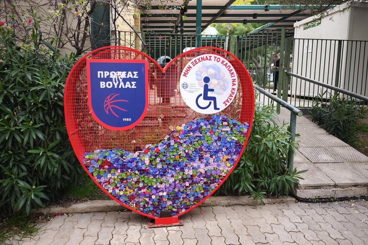 Με συνέπεια, υπομονή και στόχευση στο συγκεκριμένο ματς, όλο το προηγούμενο διάστημα, η ομάδα μας συγκέντρωνε τα καπάκια από τα νερά που χρησιμοποιούσε σε προπονήσεις και αγώνες, προκειμένου να συνδράμει στην προσπάθεια που κάνει ο Πρωτέας. Η κόκκινη καρδιά έξω από το γήπεδο της Βούλας, όπως και σε διάφορα ακόμα σημεία της Αττικής, χρησιμοποιείται για τη συλλογή από πλαστικά καπάκια για λόγους ανακύκλωσης και κάθε φορά που γεμίζει δωρίζεται ένα αναπηρικό αμαξίδιο σε έναν συνάνθρωπό μας που το χρειάζεται.
